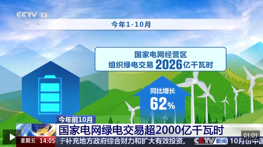 最新数据显示,今年1—10月,国家电网经营区组织绿电交易2026亿千瓦时,同比增长62%。