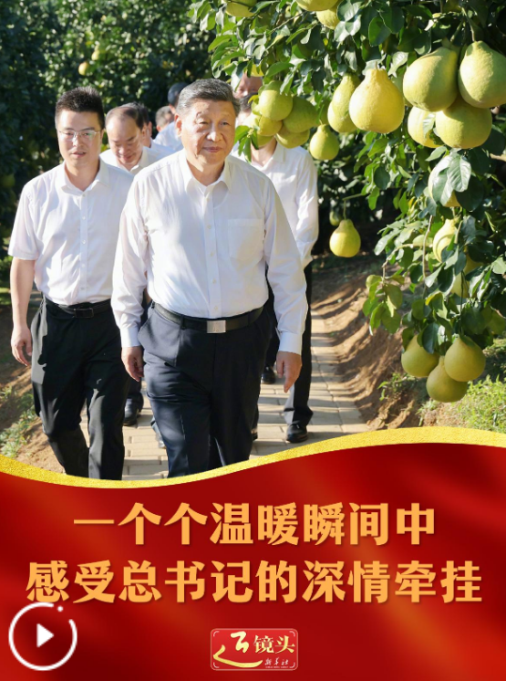 11月7日,习近平总书记在广东省梅州市梅县区雁洋镇考察南福金柚种植基地,了解当地推进乡村全面振兴等情况。正值丰收时节,南福村黄澄澄的柚子挂满枝头,总书记走进柚子林,同乡亲们亲切交流。