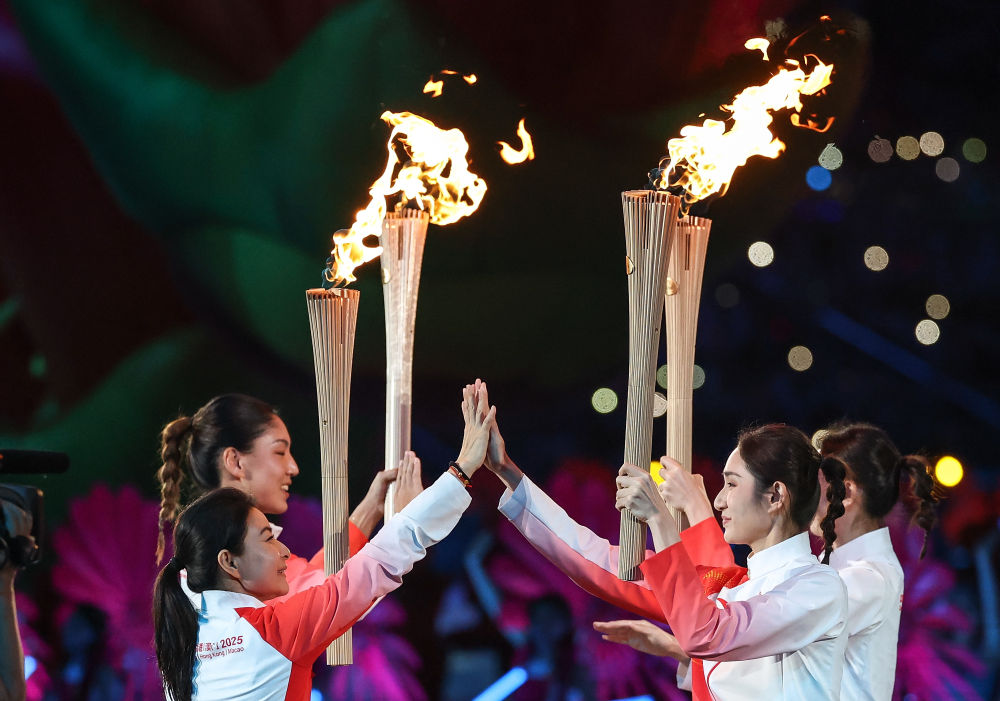 旗手护送中华人民共和国运动会会旗和第十五届全国运动会会旗入场。新华社记者卢汉欣摄
