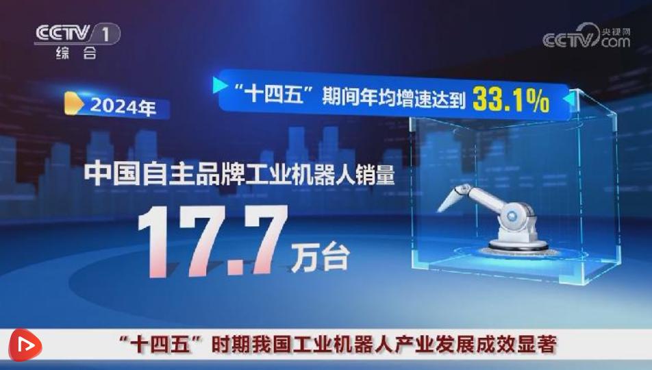 “十四五”时期,我国工业机器人产品技术加速创新迭代,显示器、伺服系统、控制器等关键零部件配套能力显著增强。2024年,中国自主品牌工业机器人销量为17.7万台,“十四五”期间年均增速达到33.1%;2024年,自主品牌中国市场占比首次突破50%,达到58.5%。