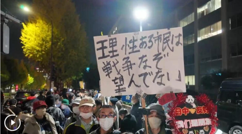 集会定于当地时间20时开始。19时前后,便有民众陆续赶到现场。抗议者们举着写有“撤回言论 反对战争”“因高市才有事”“高市下台”等标语的牌子,高喊“禁止军国主义复燃”等口号。多名抗议者要求高市对其涉台言论负责并辞去首相职务。