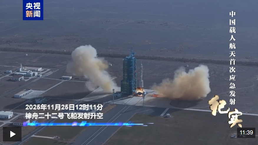 11月25日12时11分,神舟二十二号飞船成功发射,这是中国载人航天工程的首次应急发射。10月31日,神舟二十一号载人飞船成功发射。