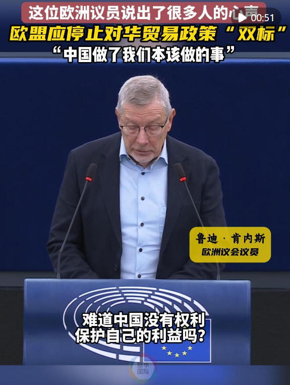 “难道中国无权像我们维护自身利益一样维护其利益吗?”比利时籍欧洲议会议员鲁迪·肯内斯25日在欧洲议会会议上发声,质疑欧盟在对华贸易政策上呈现出的“双重标准”,呼吁停止对抗中国。
