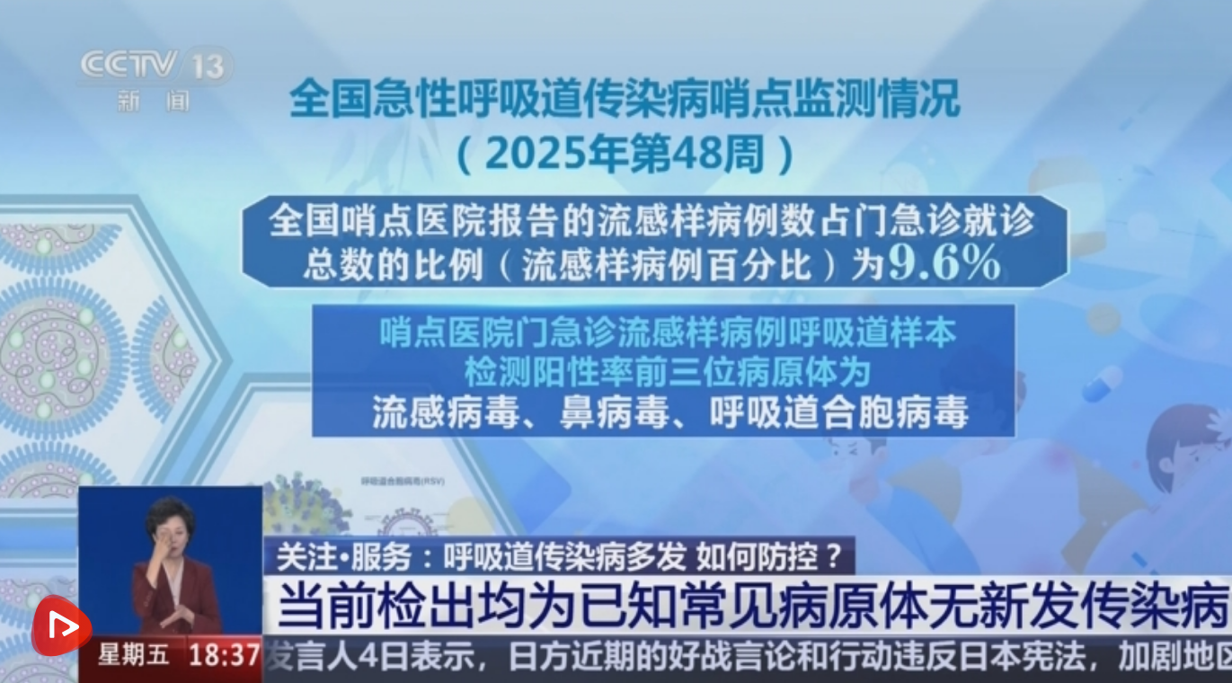 央视网消息:中国疾控中心12月4日发布,全国急性呼吸道传染病哨点监测情况显示,全国哨点医院报告的流感样病例数占门急诊就诊总数的比例(也就是流感样病例百分比)为9.6%。哨点医院门急诊流感样病例呼吸道样本检测阳性率前三位病原体为流感病毒、鼻病毒、呼吸道合胞病毒。当前,检出均为已知常见病原体,没有发现未知病原体及其导致的新发传染病。