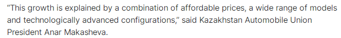 文章称,中国汽车制造商顺应了哈萨克斯坦的国情,积极与当地车企合作,取得了亮眼的成绩。文章以哈萨克斯坦领先的汽车品牌代理、制造和销售企业——阿斯塔纳汽车公司(Astana Motors )为例。该公司是多个中国品牌汽车的哈萨克斯坦代理商。与此同时,该公司积极拓展汽车制造领域业务。文章称,今年9月,阿斯塔纳汽车公司旗下的一家新的CKD工厂(指采用 完全散件进口与本地组装结合模式 的海外生产基地)正式投产,据悉,该工厂能够年产逾12万辆包括多个中国品牌在内的汽车。