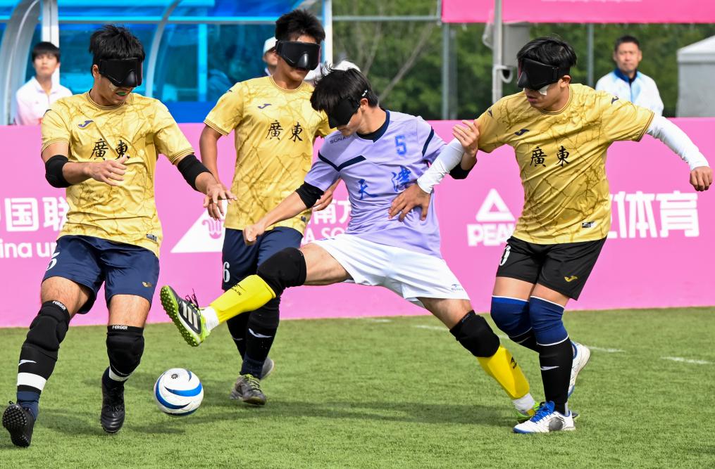 12月14日,在广州举行的全国第十二届残疾人运动会暨第九届特殊奥林匹克运动会盲人足球项目男子组小组赛中,天津队1:0战胜广东二团队。图为天津队球员范海林(右二)在比赛中突破。新华社记者 陈浩明 摄