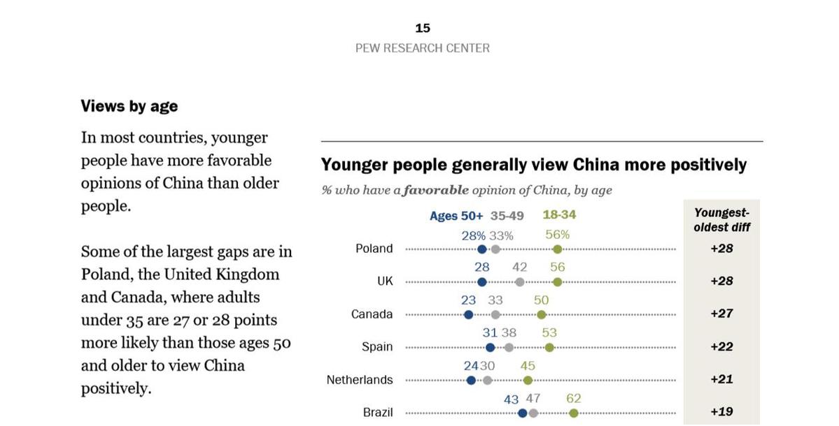 2025年7月,美国皮尤研究中心(Pew)发布的最近一期全球调查报告显示,基于25个国家逾3万名受访者数据,多数国家的年轻人(通常指35岁以下)对中国持更为正面的看法。特别是在波兰、英国和加拿大,35岁以下年轻人比50岁以上年长者对华态度更为正面。这一趋势覆盖高收入和中低收入国家,反映年轻一代对中国的认知正发生积极转变。