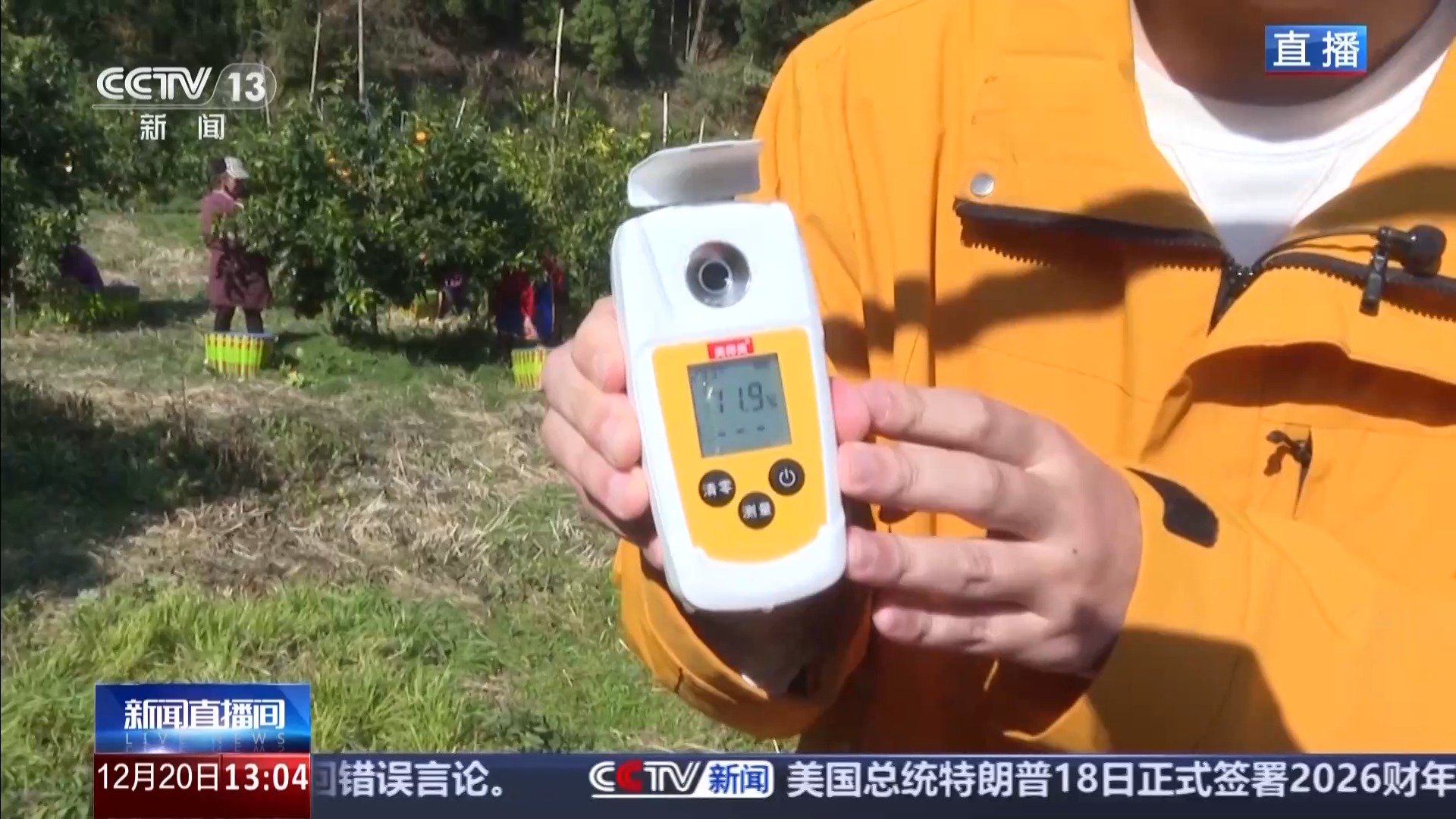 总台记者 王铣:我们来到了顺昌县洋墩乡的现代柑橘种植示范园内,这里的面积大概有350亩,共种植有15个不同品种的柑橘,有我们常见的沃柑、砂糖橘、红美人等。我身旁种植的一片就是红美人,一颗颗饱满的柑橘挂满枝头,果皮圆润、色泽亮丽。果农们穿梭在树丛间,动作娴熟地进行采摘。采摘人员告诉我,采摘也有讲究,要用手轻轻托住果实,用剪刀剪下来,要保留一部分果蒂,这样才能延长保鲜期。