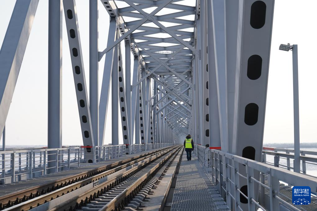 12月6日,在俄罗斯犹太自治州下列宁斯阔耶,俄方人员在跨越阿穆尔河(黑龙江)的同江-下列宁斯阔耶铁路大桥上巡视。新华社记者 刘恺 摄