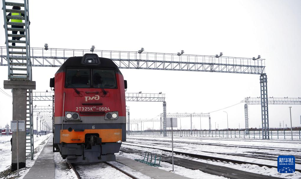 12月6日,一辆即将开往中国的俄罗斯货运列车停靠在俄罗斯下列宁斯阔耶铁路口岸。新华社记者 刘恺 摄