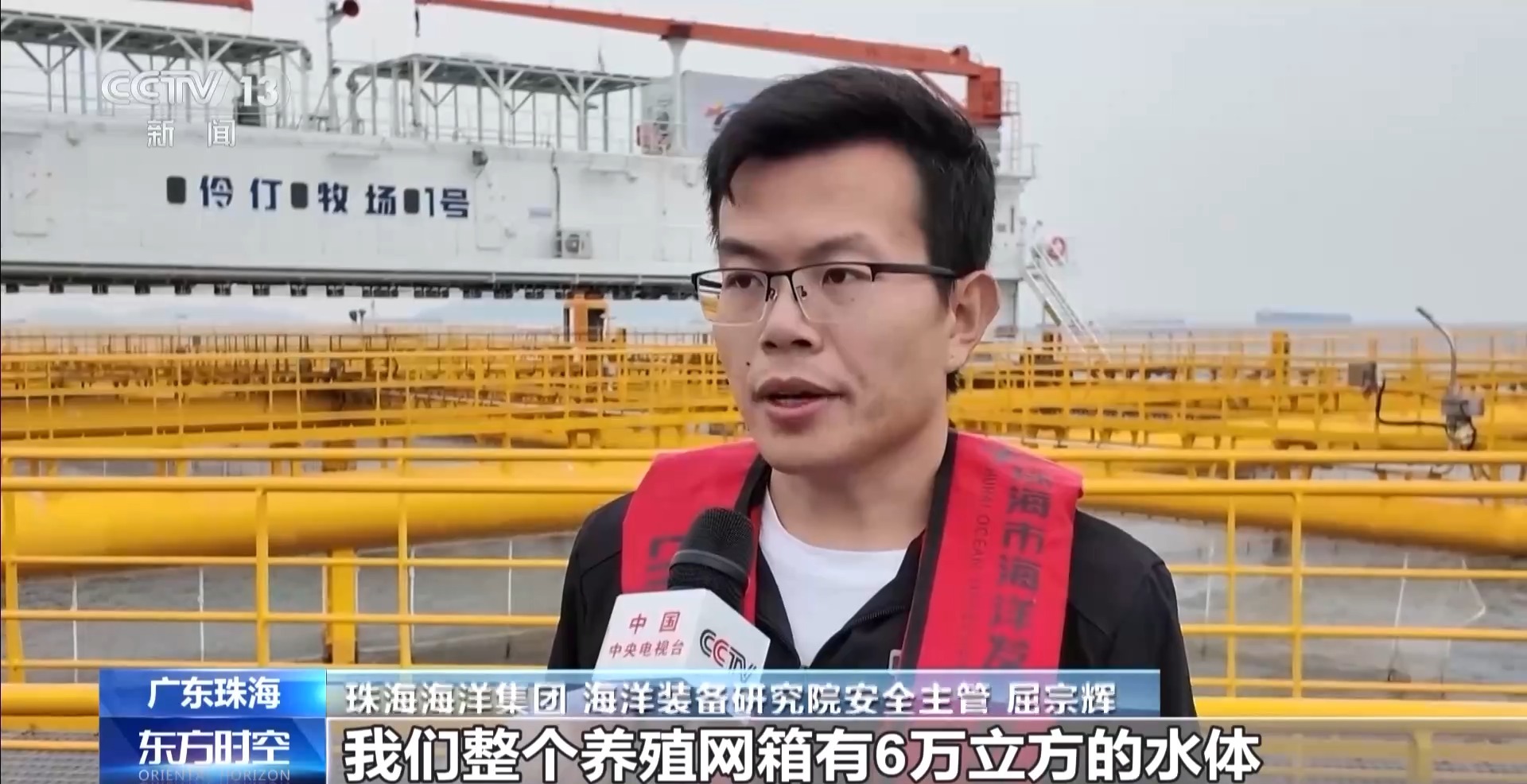 珠海海洋集团 海洋装备研究院安全主管 屈宗辉:整个养殖网箱有6万立方的水体,只需要6到8人就可以做到,相较于同样产出的重力式网箱,节约人力成本50%到70%。