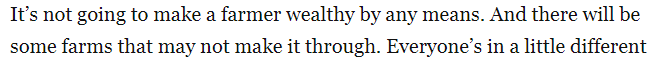 爱荷华州大豆协会主席汤姆·亚当(Tom Adam)在文章中表示,政府的农业救助计划“可能还不够。无论如何,这些救助都无法让农民变得富有,而且有些农场可能撑不过去。我听很多人说这可能是他们最后一年了:不管是破产还是想尝试其他出路。”