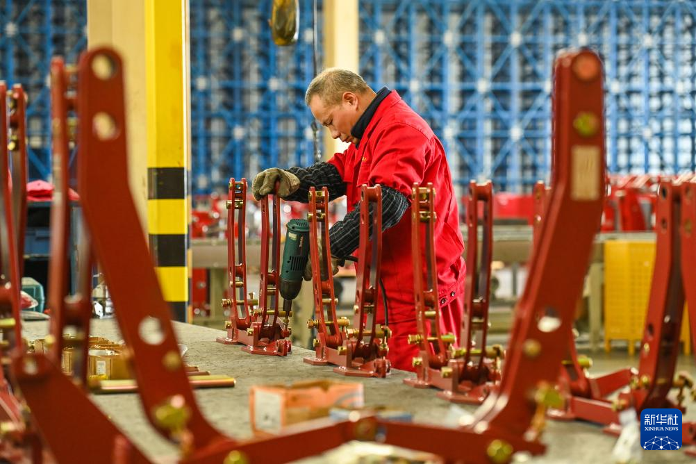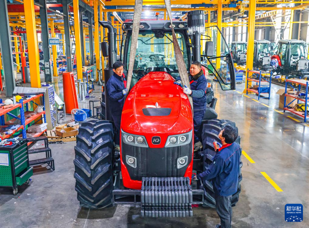 1月5日,在位于江苏省扬州市的金世纪(江苏)智能科技有限公司,工人在大马力全动力换挡智能拖拉机生产线上作业。