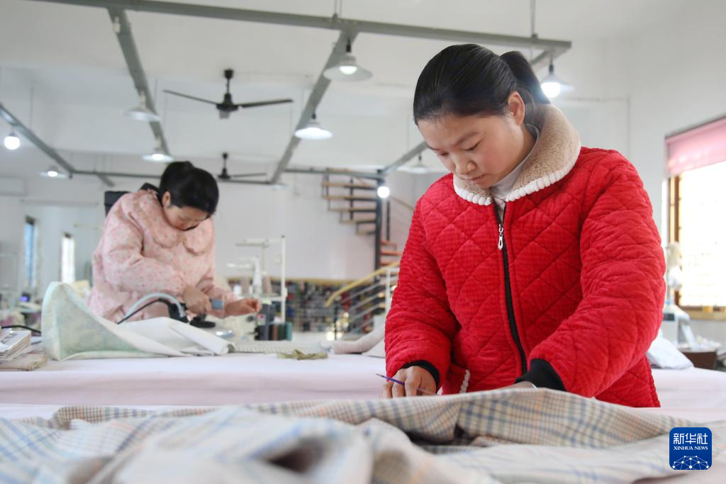 1月5日,工人在湖北省十堰市郧阳区柳陂镇龙韵村一家布艺加工厂忙碌。