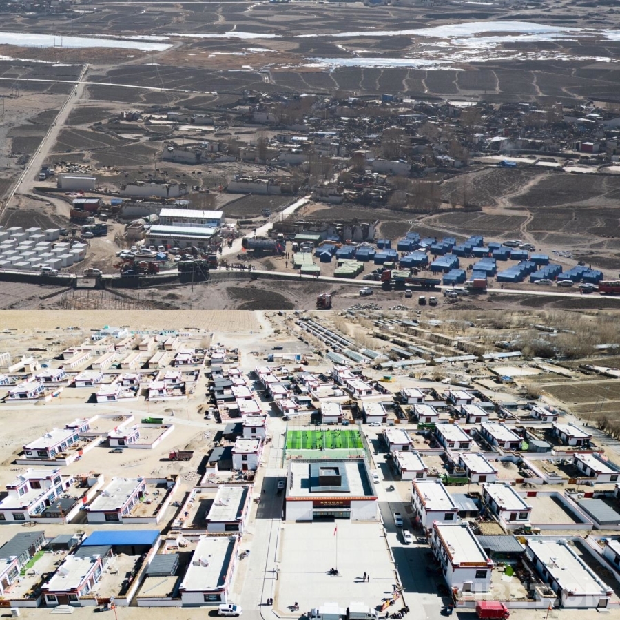 图为西藏定日地震受灾最严重的村庄之一定日县长所乡森嘎村。(拼版图片,上图摄于2025年1月11日,下图摄于2026年1月5日)摄影:赵振宇