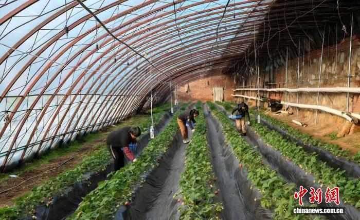 山西晋城高平市米山镇侯家庄村璟禾草莓采摘园的温室大棚里,村民们穿梭在田垄间,轻轻采摘成熟的草莓。冯甘霖 摄