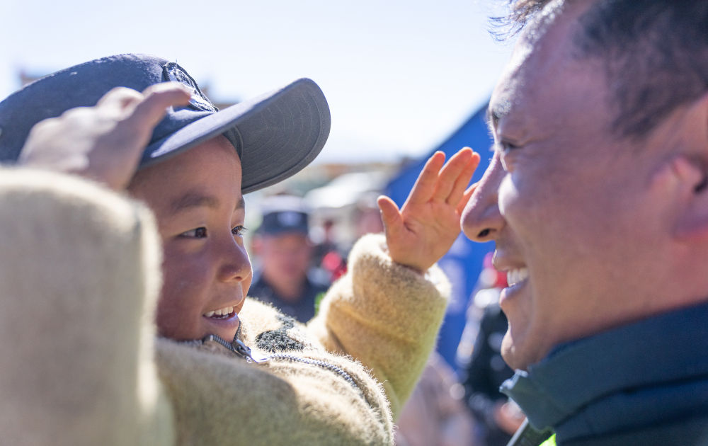 2025年1月14日,在受到地震波及的西藏定日县长所乡嘎布村,一名小朋友戴上了参加抗震救灾工作的移民警察米玛次仁的帽子,向他敬礼。新华社记者 丁增尼达 摄
