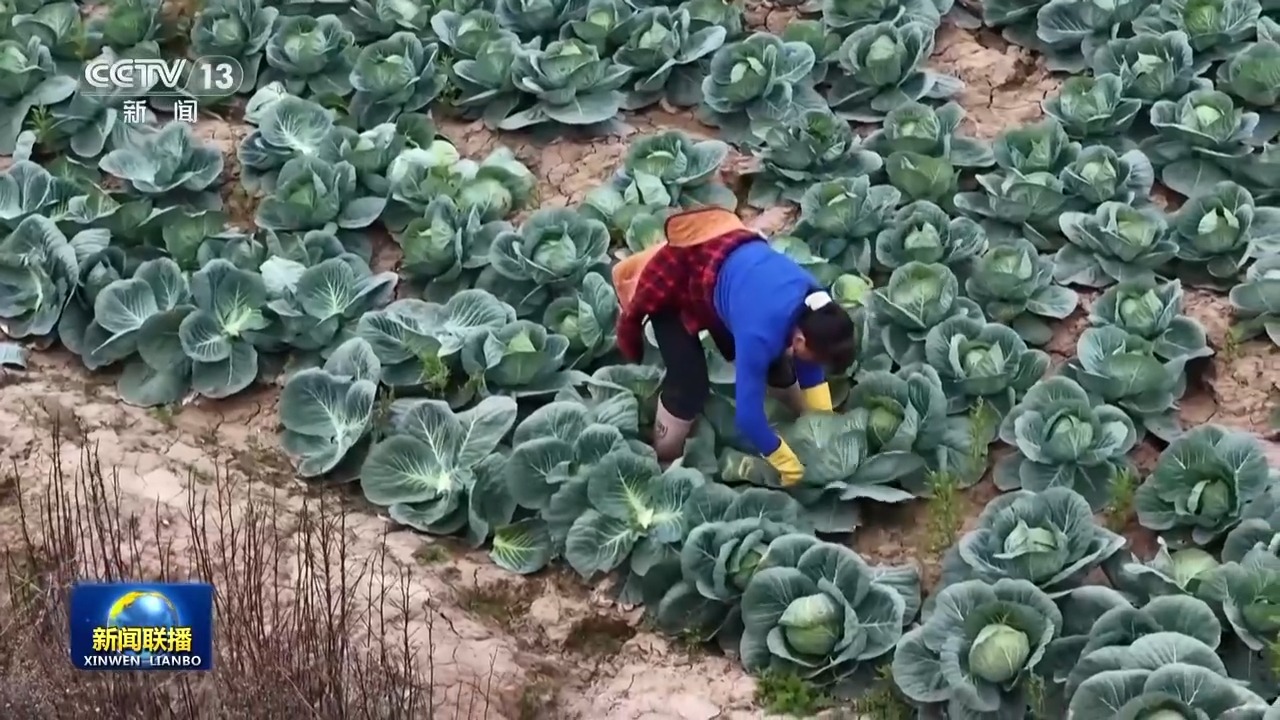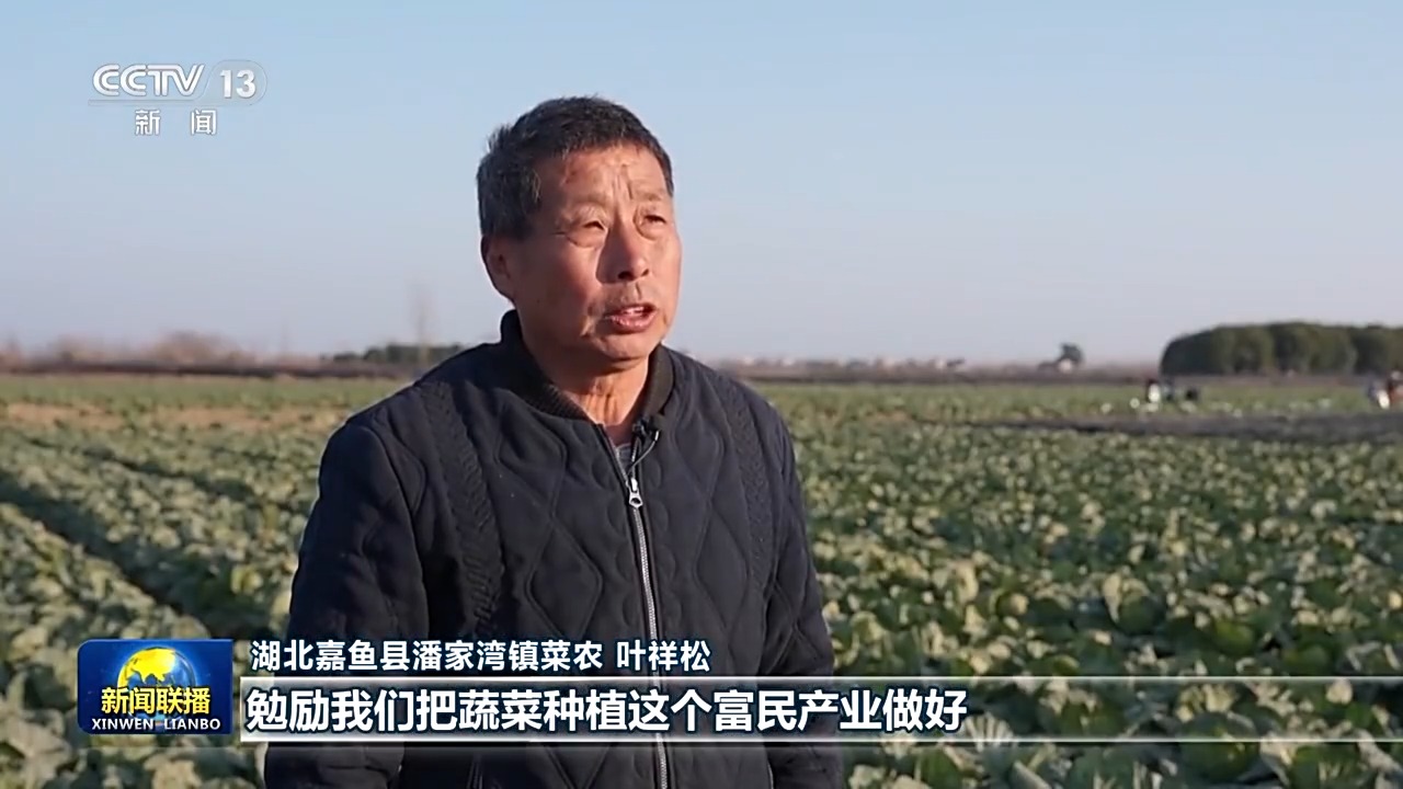 湖北嘉鱼潘家湾镇十里蔬菜长廊里,甘蓝菜喜获丰收,村民们正忙着采摘、销售。2024年11月,习近平总书记来到这里考察,勉励大家把蔬菜种植这个富民产业做好,菜农叶祥松当时就在场。