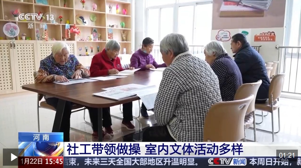 在河南淇县老年公寓,针对最近低温雨雪冰冻天气,增加了室内文体活动的时长和种类,不仅有社工带着老人们做操锻炼身体,还安排了书法、阅读、象棋等丰富多彩的文体项目,丰富老人们的室内生活。