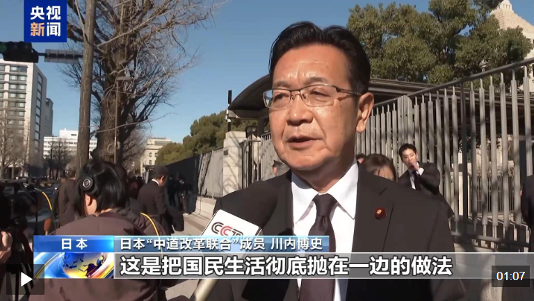 日本“中道改革联合”成员 川内博史:这是把国民生活彻底抛在一边的做法,毕竟是把预算案直接搁置,不合常理。关于解散众议院的正当理由,之前高市说是“你们觉得我怎么样”“你们觉得高市内阁怎么样”?我们明确表示,不信任高市内阁,要推翻高市内阁,要支持民众的生活。