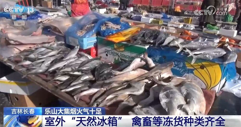 接着往里走,这里就是东北特色十足的生鲜冻货区了。长春的冬天,室外零下20多摄氏度,堪称“天然大冰箱”。您看这冻鱼、冻豆包冻得老硬了,还有冻梨、冻柿子,都是东北人节庆团圆必备的滋味,化透之后一口咬下去满是汁水,清甜可口。