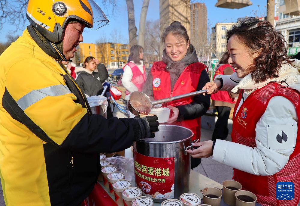 1月25日,河北省秦皇岛市海港区海滨路街道开滦路社区开展“飘香腊八粥 温馨暖人心”活动。这是志愿者为网约配送员盛腊八粥。