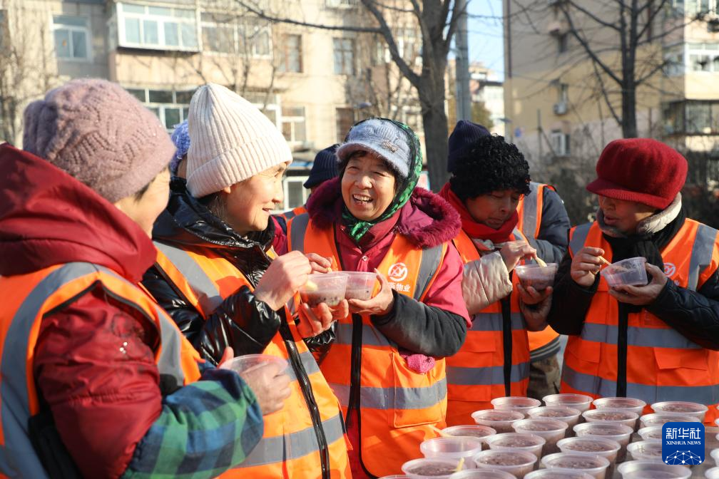 1月25日,在河北省唐山市丰润区燕山路街道欣园社区,环卫工人品尝志愿者送来的腊八粥。