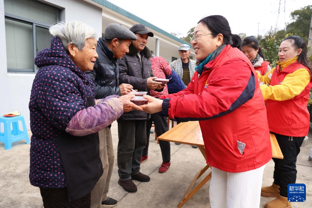 1月25日,在浙江省舟山市定海区摘箬山岛,志愿者为老人们送上腊八粥。