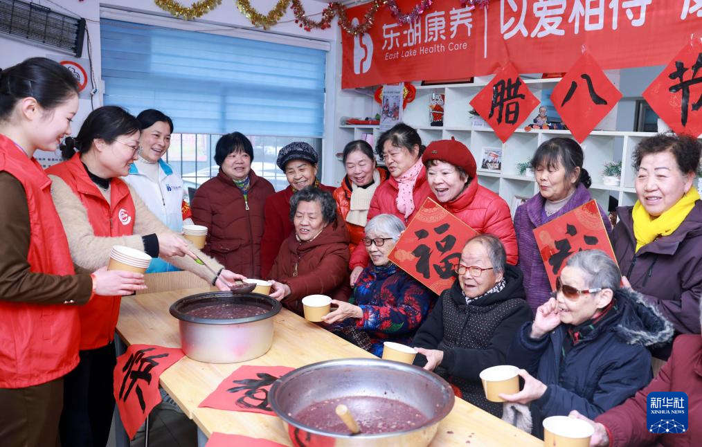 1月25日,在湖北省武汉市黄鹤楼街道读书社区老年人活动中心,老年人品尝腊八粥。
