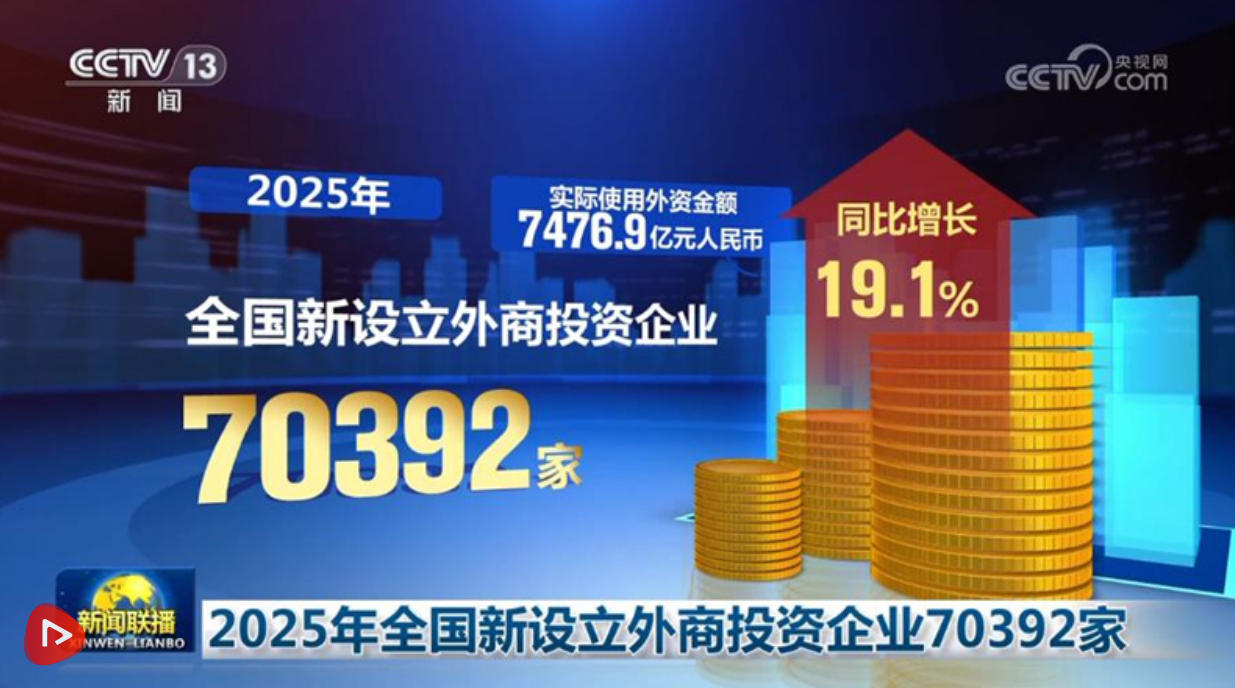 央视网消息(新闻联播):商务部数据显示,2025年,全国新设立外商投资企业70392家,同比增长19.1%;实际使用外资金额7476.9亿元人民币。