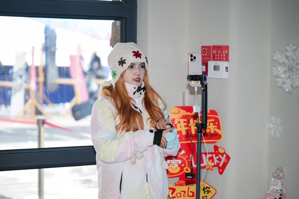 1月25日,主播在新疆那拉提哈茵赛滑雪度假区直播。近年来,依托得天独厚的自然禀赋,新疆那拉提景区开发冰雪资源,完善冬季旅游设施,打造集滑雪、休闲等于一体的冰雪旅游目的地,将“冷资源”转化为推动旅游高质量发展的“热动力”。 新华社记者 徐宏岩 摄