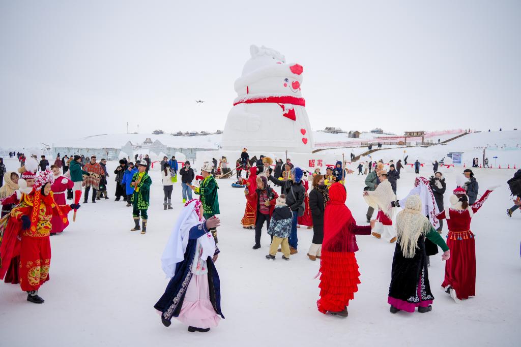 2026年1月1日,在新疆昭苏县湿地公园,演员与游客共同跳舞。新华社记者 徐宏岩 摄