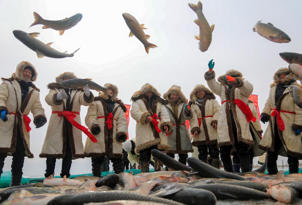 1月18日,渔民在博湖县博斯腾湖冰面上进行冬捕作业。这次巨网冬捕活动,吸引各地游客前来观赏。 新华社发(年磊摄)
