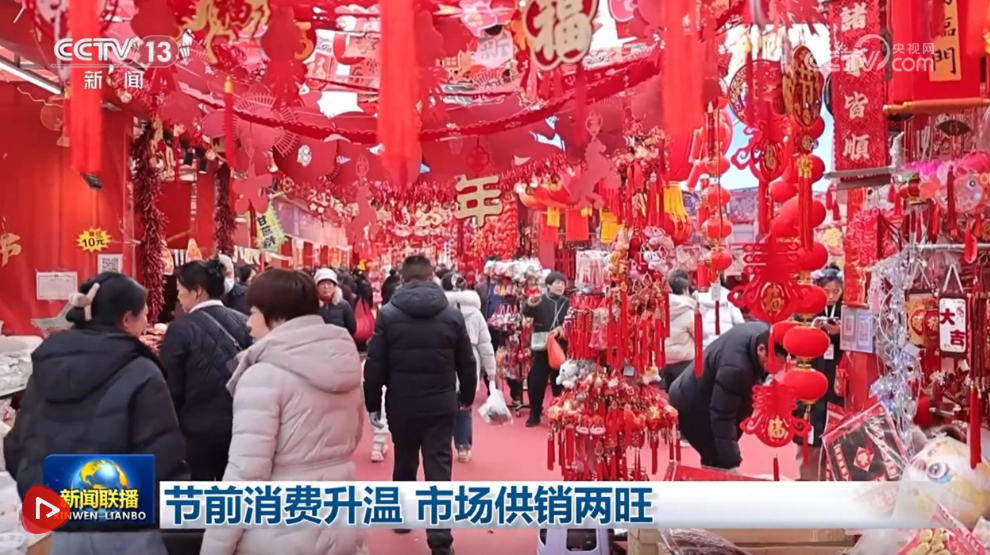央视网消息(新闻联播):随着春节临近,消费市场持续升温,各地年货供应充足、销售火热,呈现一派繁荣景象。