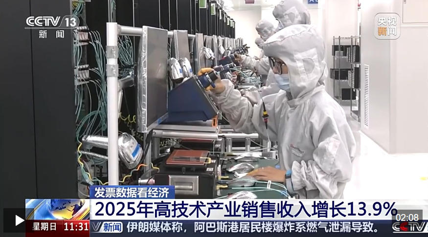 发票数据显示,2025年全国战略性新兴产业茁壮成长,高技术产业销售收入同比增长13.9%,其中高技术制造业、高技术服务业同比分别增长10.1%和16.6%。