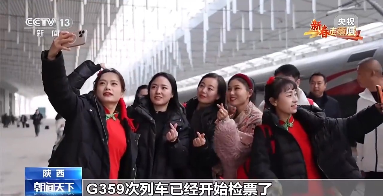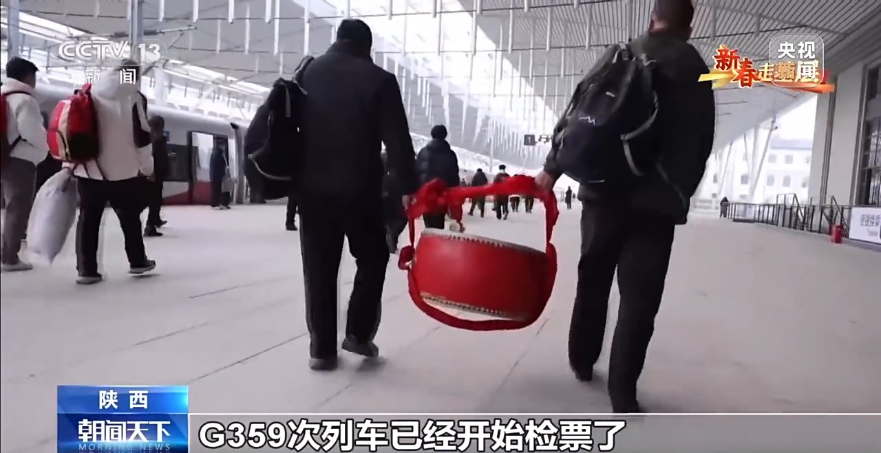 总台央视记者 郑连凯:现在的时间1月26日早上7点30分,延安的天刚蒙蒙亮,腰鼓队队员已经赶到延安站,稍后他们要搭乘延安开往北京的G359次首发列车。
