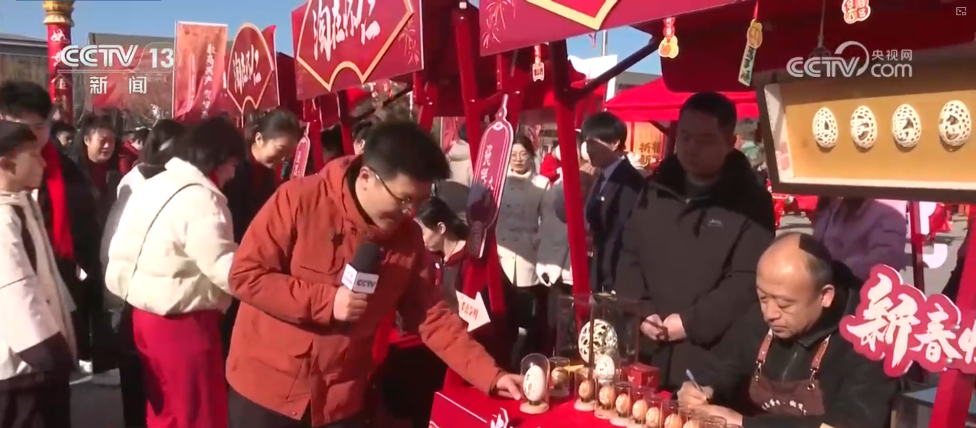 看完表演,再来逛逛好玩的展销区。这里的年货种类丰富,特色鲜明。首先是怀仁陶瓷展区,怀仁陶瓷主要是日用瓷具,也就是日常使用的勺、碗、盘、碟等,此外还有精致美观的陶瓷摆件。旁边这个展台是蛋雕,手艺人在薄薄的鸡蛋壳上精雕细琢,特别考验手艺人的功底,力度轻重、明暗层次都要拿捏精准。