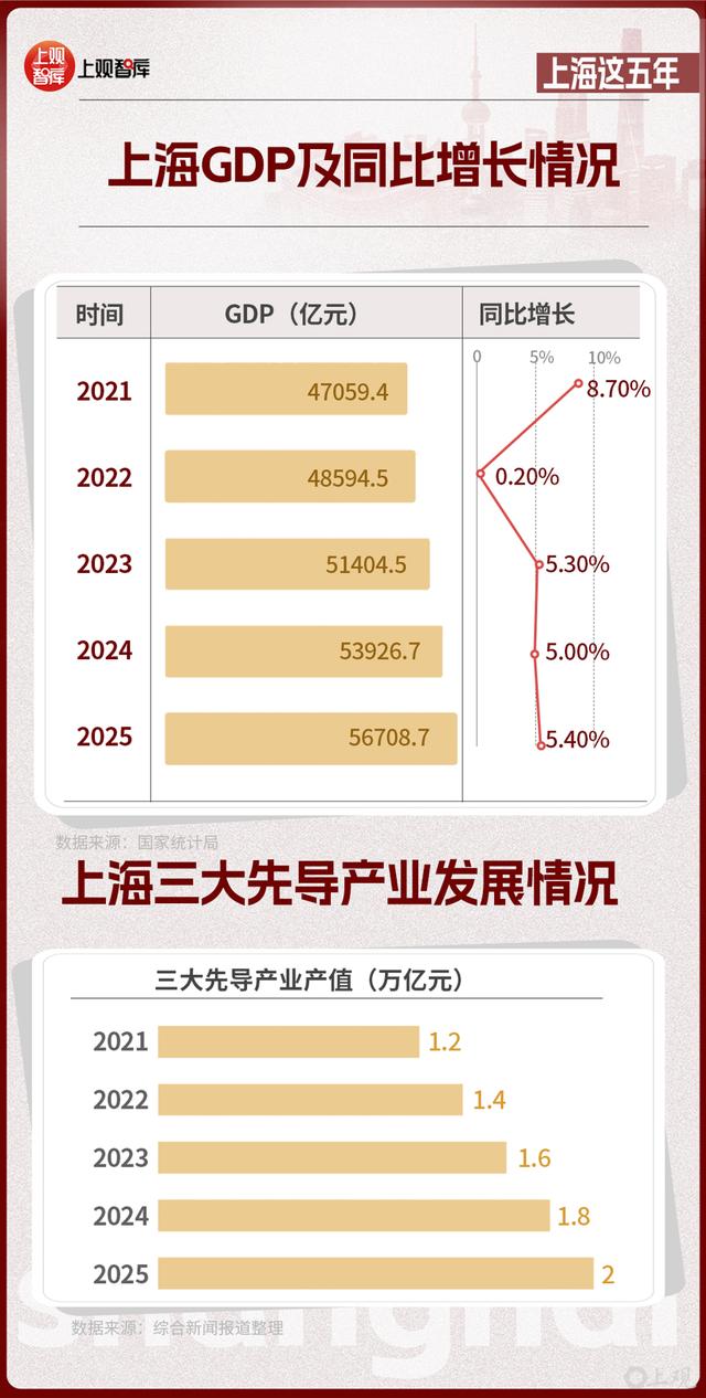 2023年,上海成为全国首个经济总量突破5万亿元的城市;2025年,上海GDP突破5.6万亿元,向下一个里程碑进发。