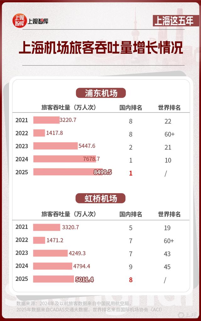 2024年,上海浦东国际机场首次排名全国旅客吞吐量第一,荣登中国最繁忙的机场。也是在这一年,上海港成为全球首个年吞吐量超过5000万标准箱的世界大港。