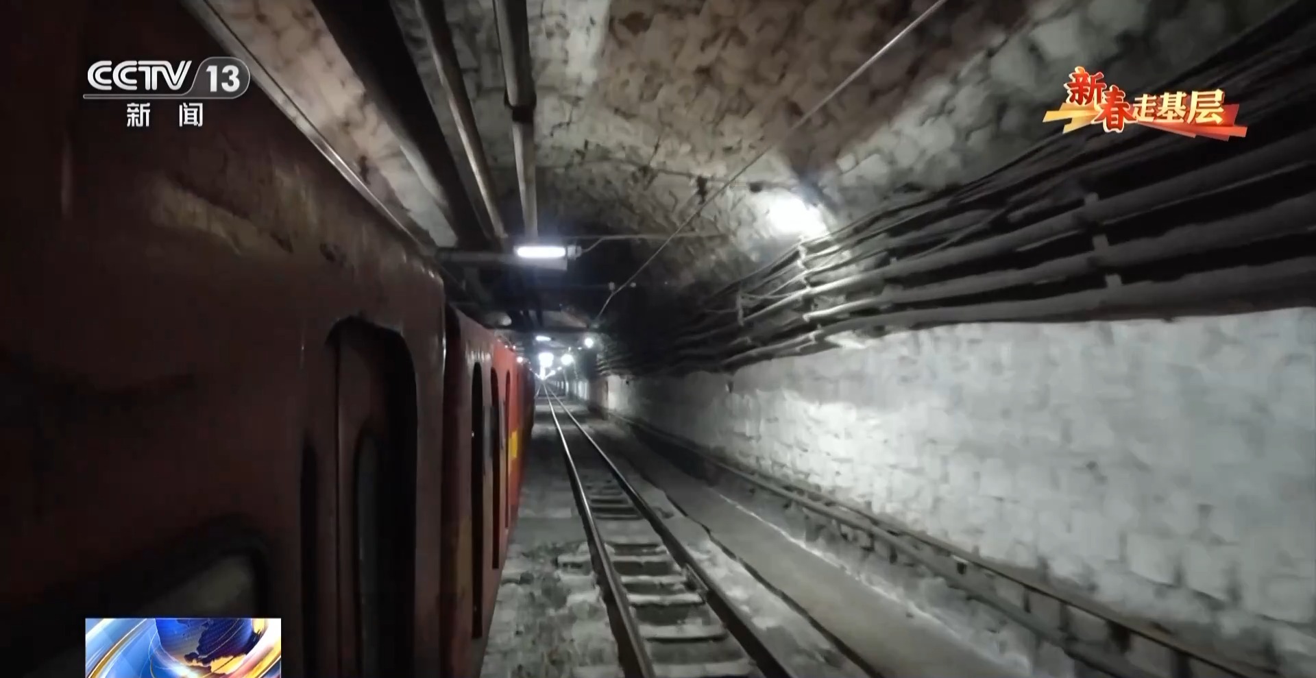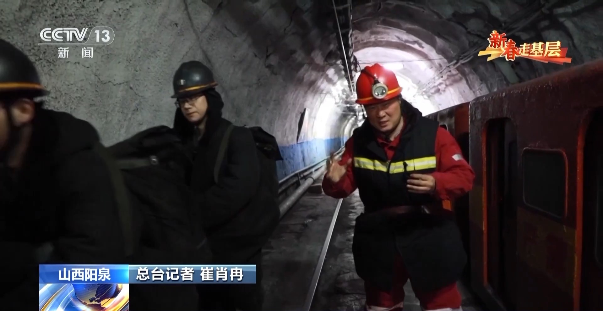 总台记者 崔肖冉:从小火车上下来,明显感觉到风力特别大,其实一路上,越往下风力是越大的,在墙上我们可以看到,上面写着距井口11900米,也就是说我们走了将近12公里了。
