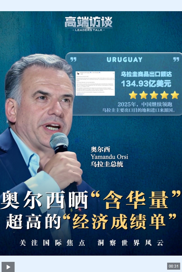 奥尔西发布的图文显示,2025年,乌拉圭商品出口额达134.93亿美元,创近十年新高,年增长率达5%。2025年,中国继续保持乌拉圭第一大出口市场地位,乌拉圭对华出口额达到34.93亿美元,较2024年增长约12%。同时,中国也是乌拉圭商品进口的主要来源国,主要进口商品包括视听设备、车辆和机械设备。此前,西班牙《国家报》指出,乌拉圭每4美元的商品出口收入中,就有1美元来自中国。