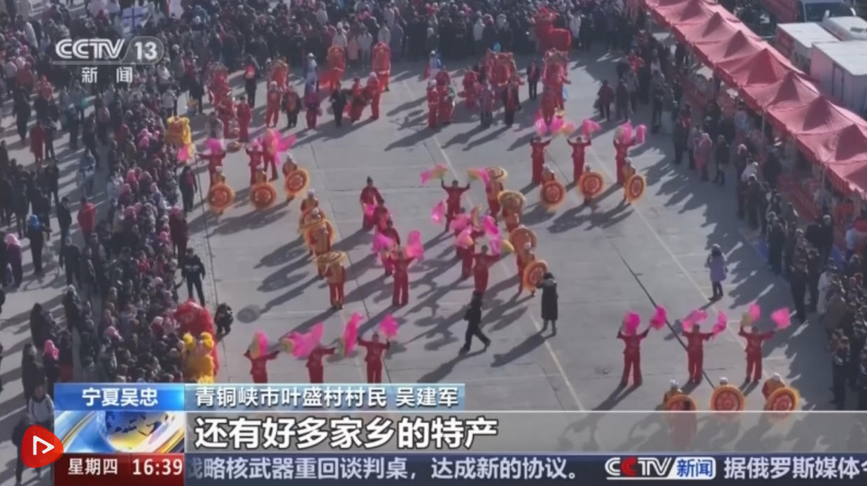 锣鼓敲起来,社火闹起来。在吴忠青铜峡的叶盛大集上,热闹的迎新春表演给乡村集市增添了不少年味。周边村子的村民们换上社火服饰,踏歌起舞,让喜庆热闹的氛围铺满集市。