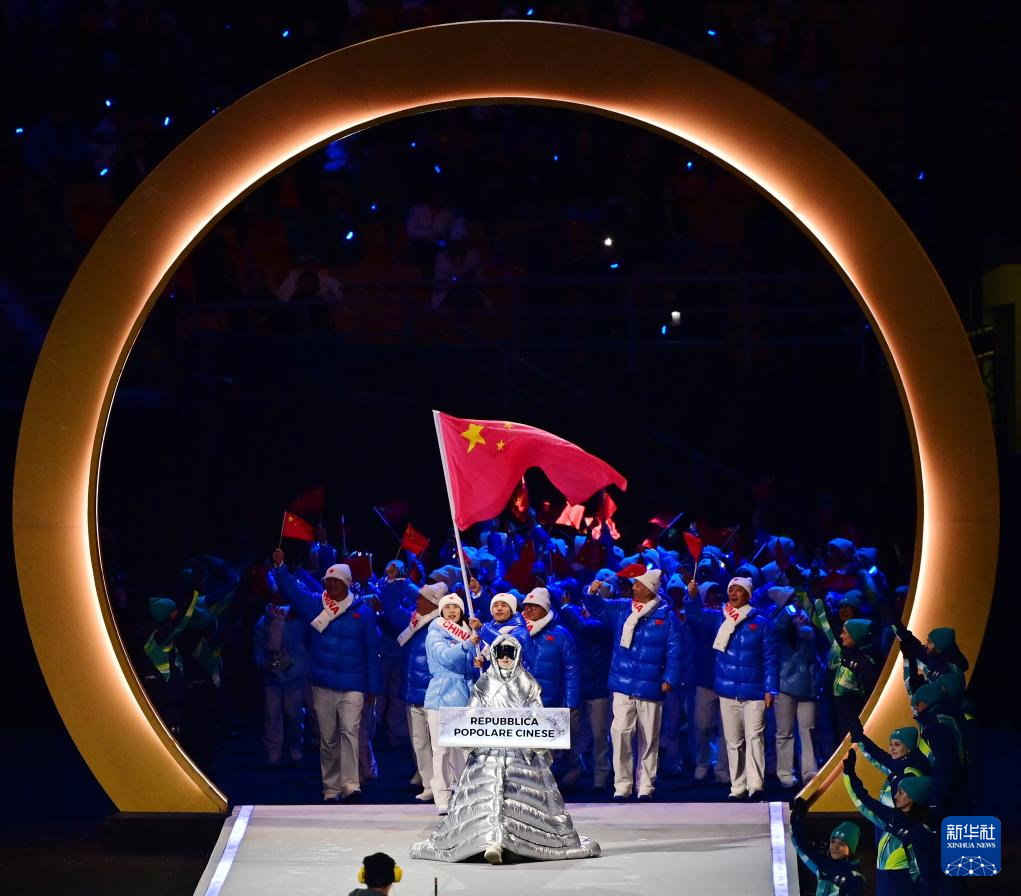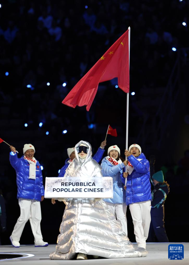 2月6日,中国体育代表团成员在意大利普雷达佐参加入场仪式。