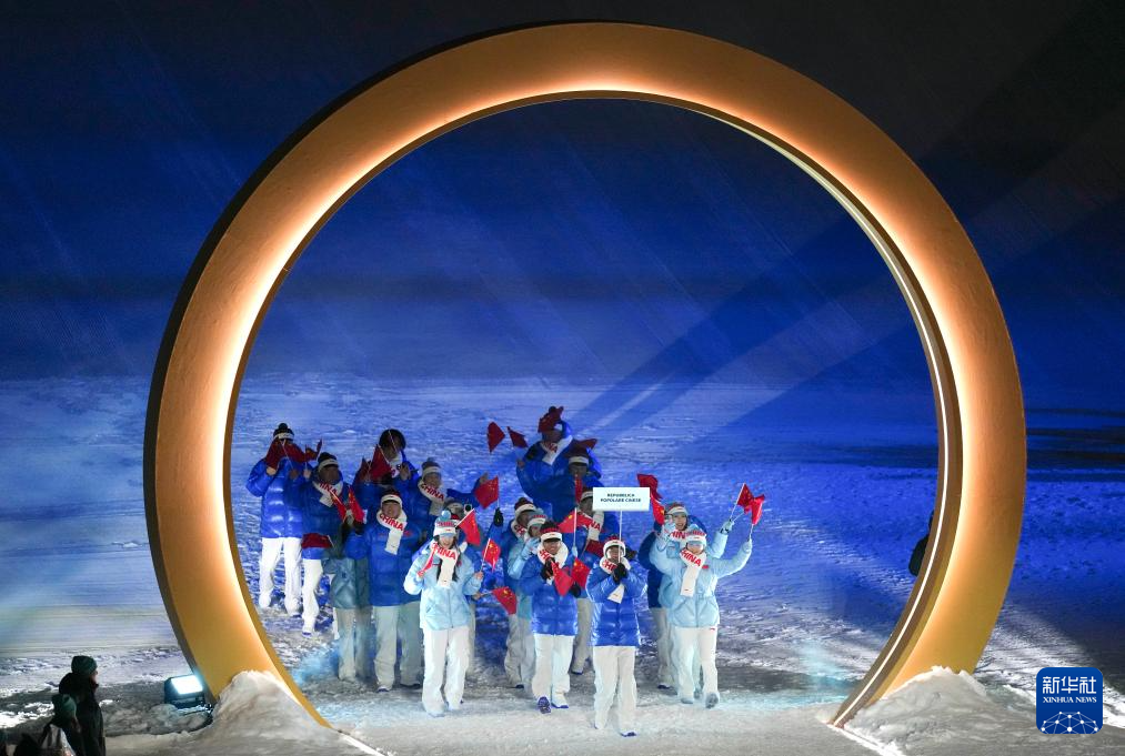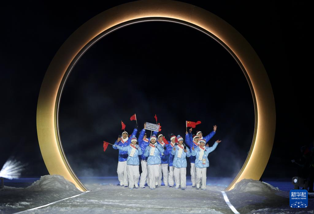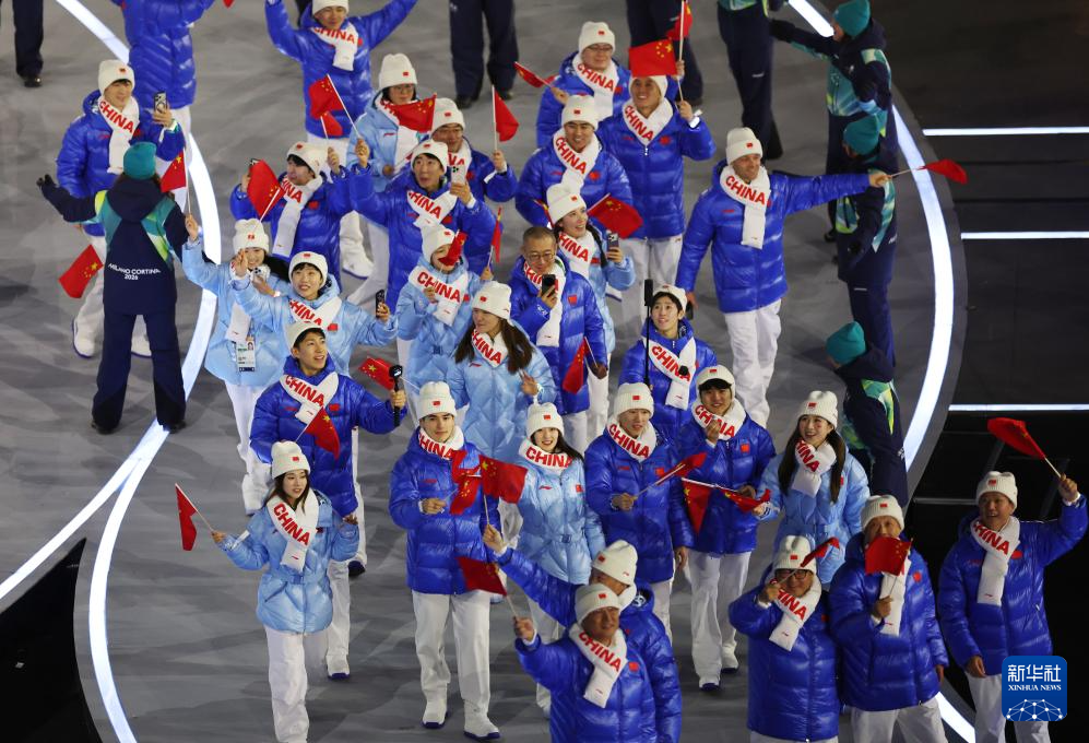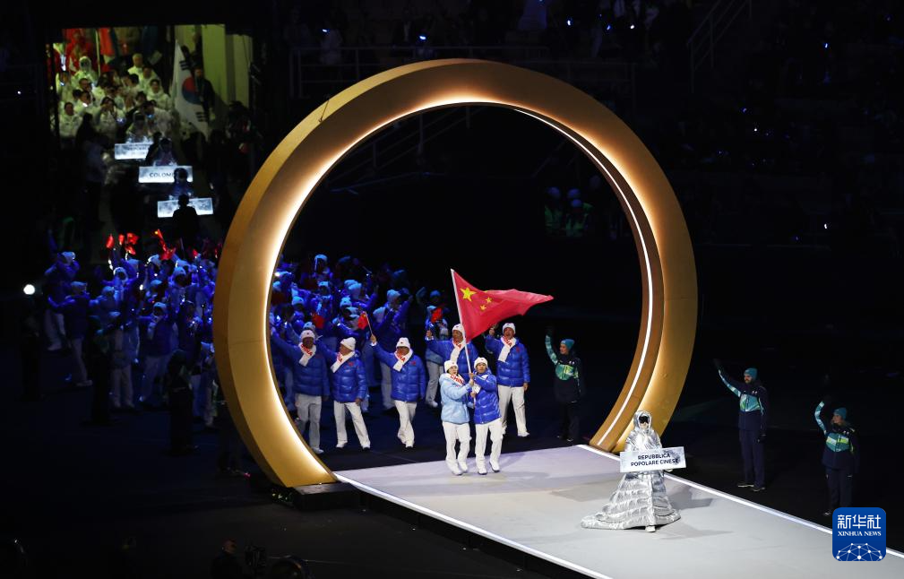 2月6日,中国体育代表团在普雷达佐跳台滑雪中心入场。