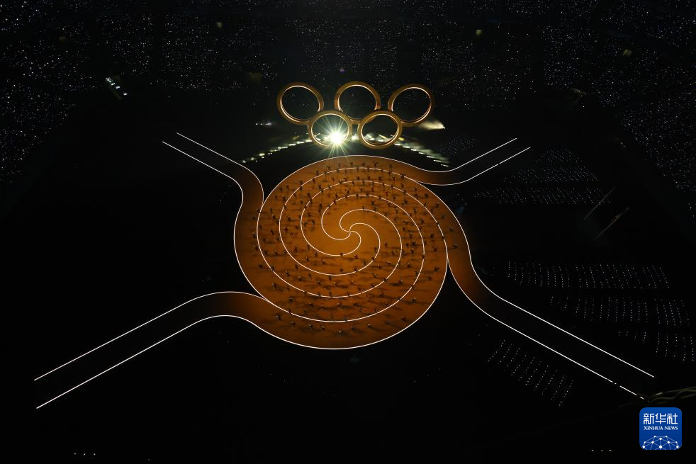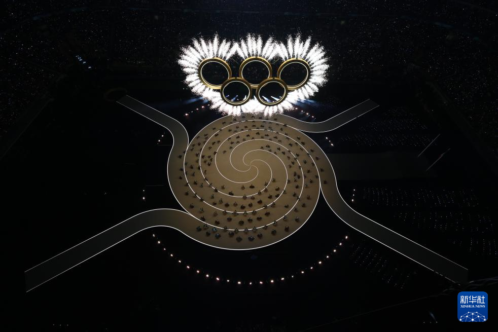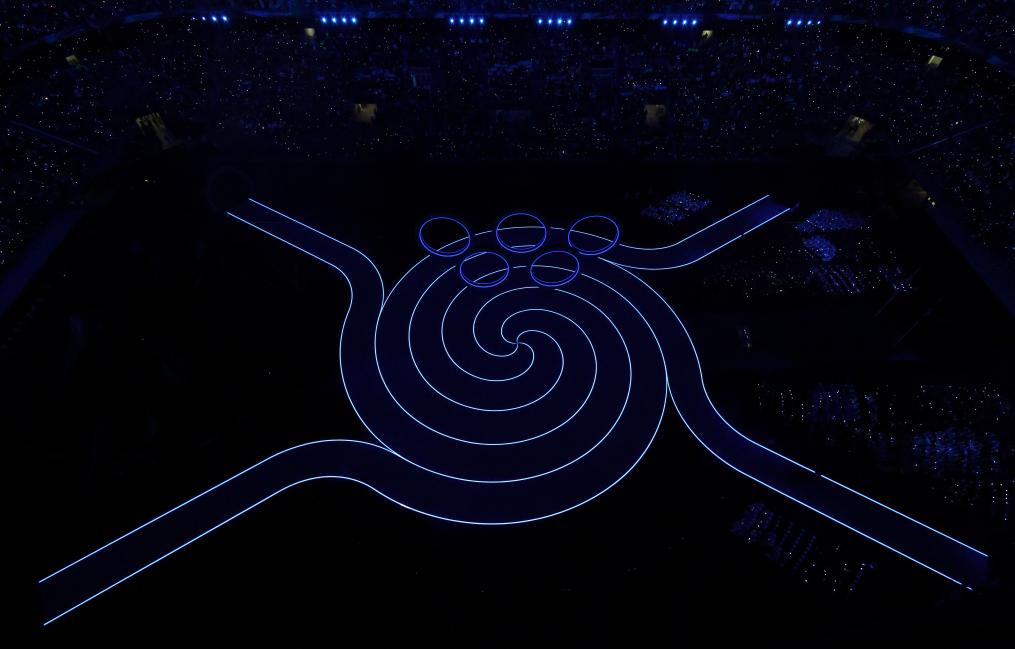 这是2月6日拍摄的开幕式现场的奥运五环。