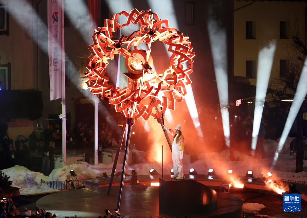 2月6日,在科尔蒂纳迪博纳广场,火炬手点燃主火炬。