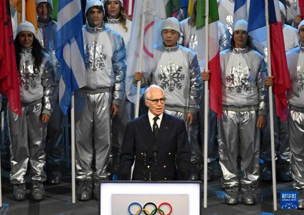 2月6日,米兰-科尔蒂纳冬奥会组委会主席乔瓦尼·马拉戈(下左)在开幕式上致辞。