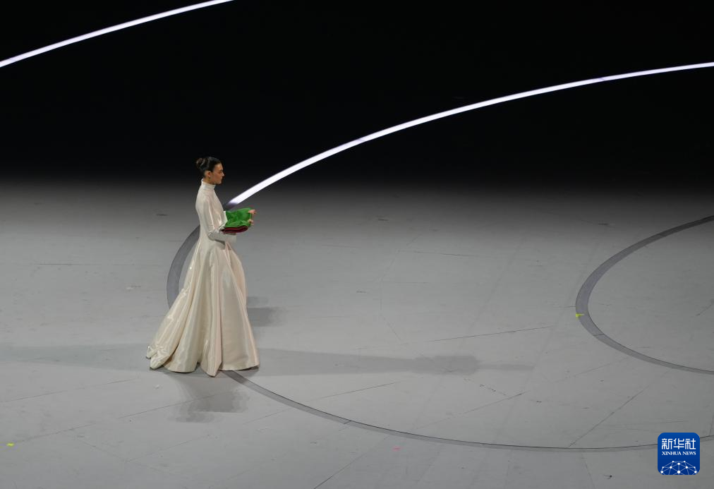 2月6日,模特维多利亚·切蕾蒂在开幕式上手捧意大利国旗入场。