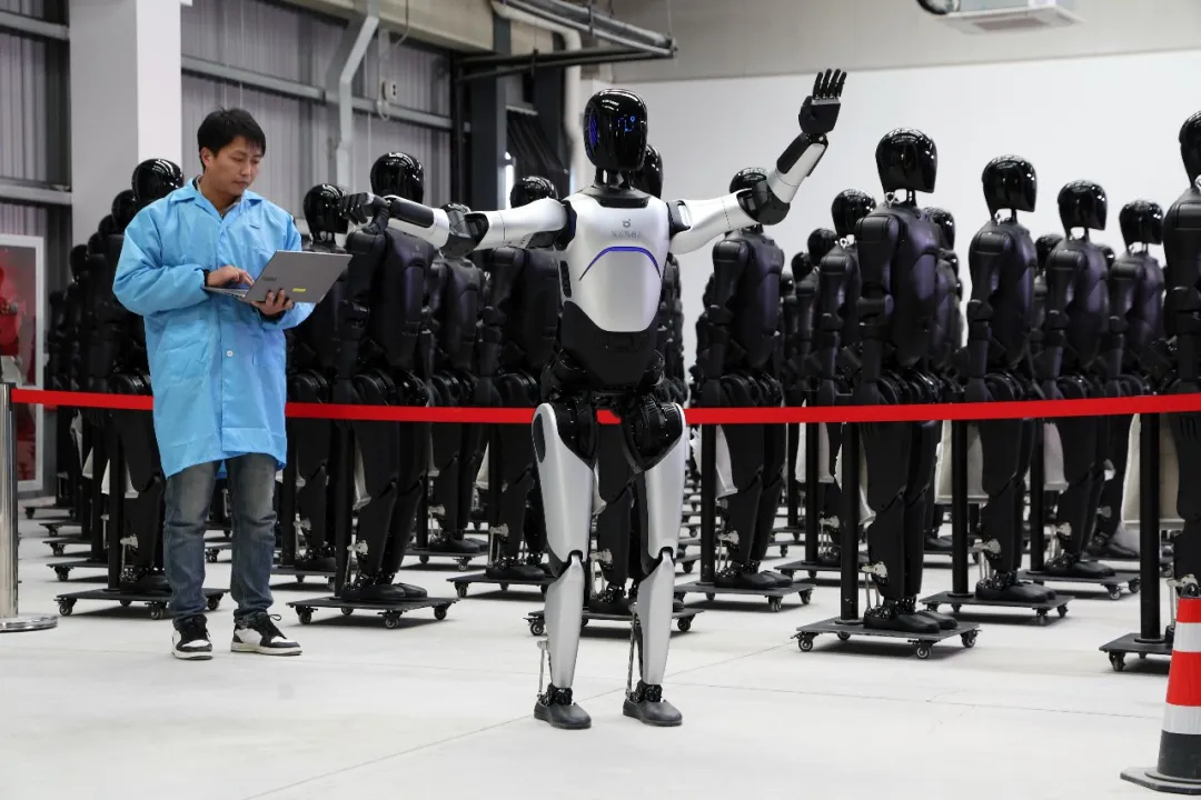 2025年12月8日,上海,工程师在量产工厂调试机器人。当日,智元第5000台通用具身机器人——灵犀X2正式量产下线。中新社记者 汤彦俊 摄