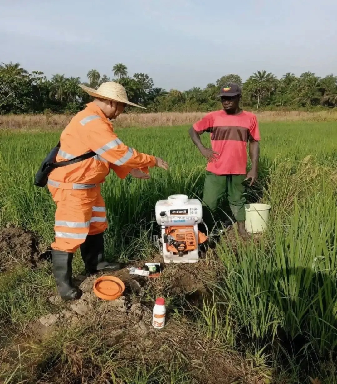 一月的尼日利亚北部,天空湛蓝如洗,阳光灼热刺眼。雨季充沛的降水已经过去,土地变得干硬。在吉加瓦州的水稻育种基地,杨秀刚戴着遮阳帽,裤腿挽到膝盖,正用当地语言大声指挥着。他身旁,十几名尼日利亚农技人员跟着他的示范,用力将铁锹踩进土里,翻起一块块褐色的土坯。